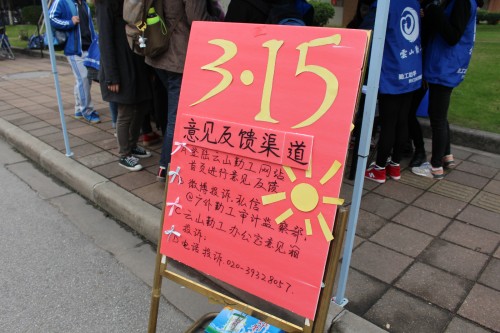 同学们也热情高涨,填完问卷后,在工作人员的指引下去到抽奖摊位抽奖。此外,摊位前面还贴着云山勤工的各种反映投诉方式,如登录勤工网站首页进行意见反馈、云山勤工意见箱投诉等。