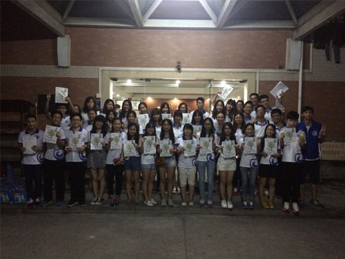 本网讯 2015年9月15号晚9点,校道上响起一阵小推车隆隆声。一群身穿蓝白色T恤的人拉着满车的凉茶正向新生宿舍前进。他们是云山勤工的董事及管理层,在今晚,他们举行新生慰问活动,把一罐罐凉茶亲手送到新生们的手中,让新生们感受到勤工的热情。