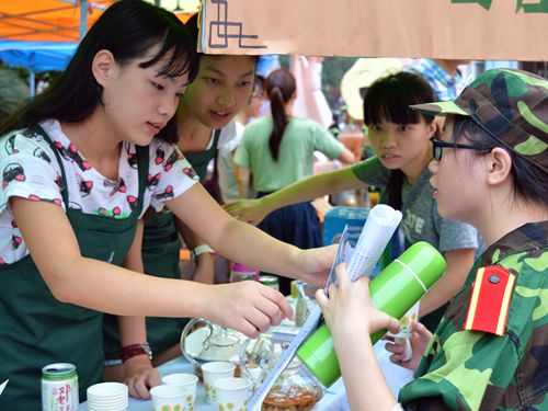 上午11点钟左右,有军训任务结束的师弟师妹们陆续地经过摊位,现场渐渐地热闹起来。为了吸引新生的注意,各个职能部门和实体都使出浑身解数。云山咖啡屋(北,以下称啡屋)和云山小站(北,以下称小站)联合宣传,现场的每个啡屋、小站员工都穿上平时的工作服,在桌上摆满了美味的小食和饮品,热情地跟前来咨询的新生互动交流。而其他的部门和实体,例如财务部就设置了抛物抽奖的的小游戏,有的勤工工作人员还为前来咨询的新生们撑起了一把把蓝色的勤工伞和送上一瓶凉茶,给他们心里带来一阵阵清凉。