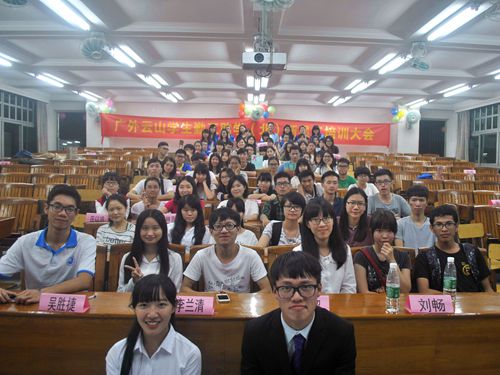本网讯 2015年11月19日星期四晚九点半广外云山学生勤工助学(北)新员工培训大会(以下简称培训会)在二教114教室如期举行。培训会由陆峰浩、谢琦蓉两位男女主持人主持。指导老师刘畅、优秀校友嘉宾陈杰超、常务董事李兰清以及常务副董事吴胜捷出席了此次会议并担任此次培训会的培训人员,云山勤工(以下简称勤工)各个职能部门与实体皆派出代表参与了本次培训会。
