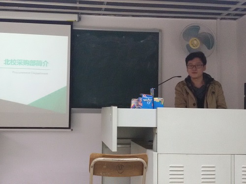 首先是北、南采购经理的先后讲话,两位经理分别介绍了部门情况。北采购经理魏基鑫强调的是北采购的团结友爱。向我们展示了各届采购部的合照,并介绍了曾在采购部任职的员工在毕业时其他员工与其合照的惯例。南采购经理安靖一则给我们介绍了南采购的特色项目小组——小组成员(不限内外部门)以公益的形式做创业。另外,下学期南采购还打算开展“图书角”、“演讲”、“大型项目比赛”等一系列活动。在这个环节的最后北采购还给南采购赠送了小礼物。