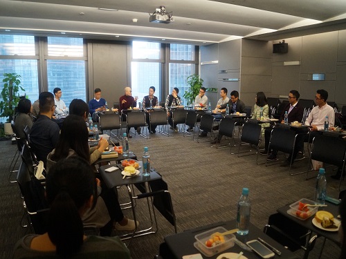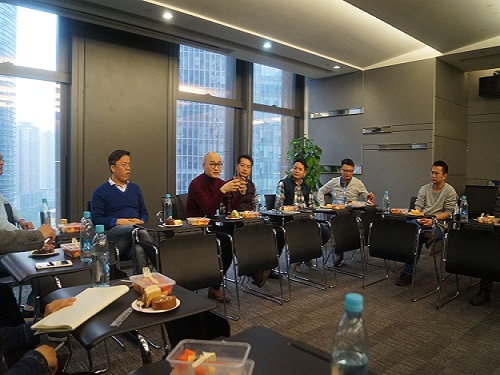 本网讯 2015年12月13日下午,由广外云山学生勤工助学(以下简称“云山勤工”)校友会理事会组织的校友企业走访活动在韩后企业广州总部顺利举行。此次活动由韩后新任总裁肖荣燊主持,校友会会长李国兴,副会长陈智谦、郑石锦,副秘书长许伟灿,多名校友会理事会成员及云山勤工指导老师陈哲列席参加活动。