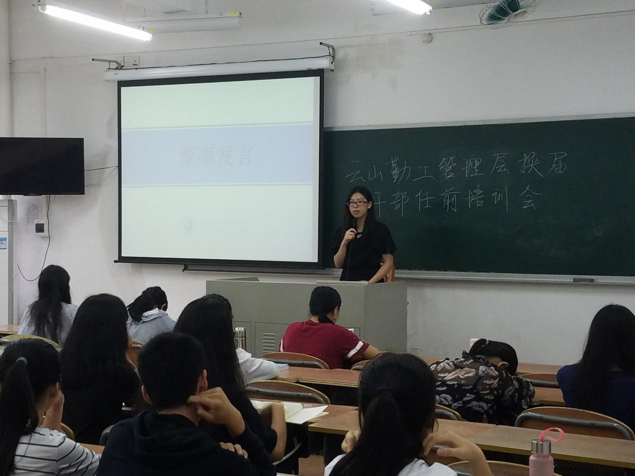 培训会由云山勤工常务董事邓银杏的发言拉开序幕,她为新一届的管理层带来了三点寄语。首先,作为云山勤工的管理层人员必须要培养和确立的观念就是“大勤工意识”,她希望大家在管理自己所在团队的同时也要对整个勤工的发展多加关注。其次,在勤工处于改革的大环境下,要将重心放在急需整改和可行性大的制度变革上,并在这一个月的实习期中熟悉好管理层的各项工作。最后,董事希望每位新一任管理层都可以把握好这一年的任期,做出优秀的成绩。