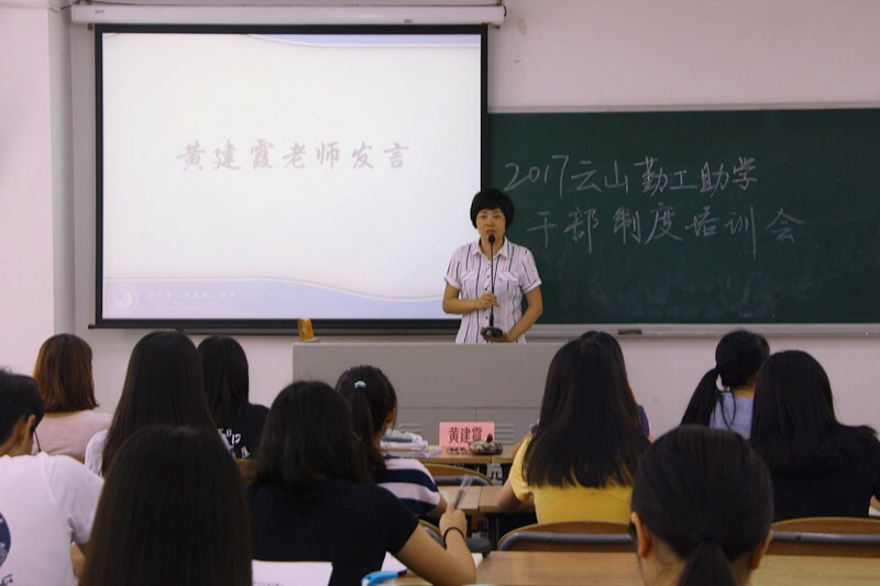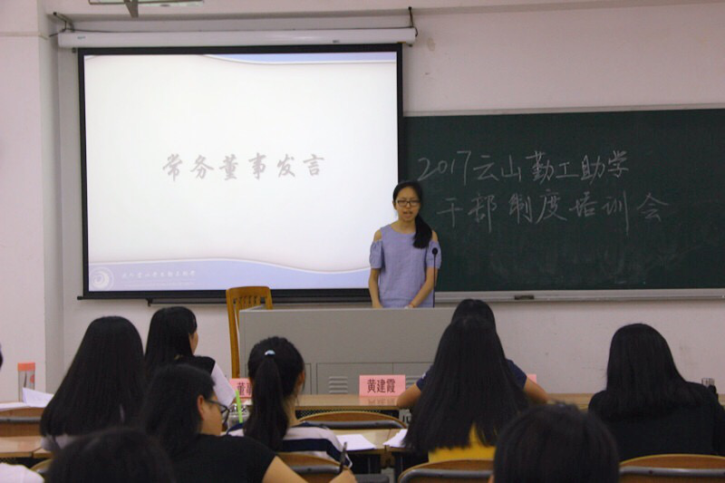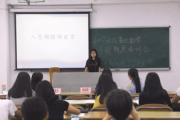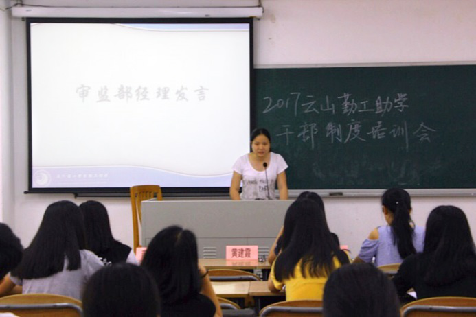 本网讯 2017年6月1日,云山勤工助学干部制度培训会在北六教b304教室召开。培训会由勤工人力资源部和董事会联合举办。出席本次培训会的有勤工指导老师黄建霞和新任管理层。黄建霞老师、常务董事郭静怡、人资部经理陈思婷及审监部经理罗蔚琳先后发言。