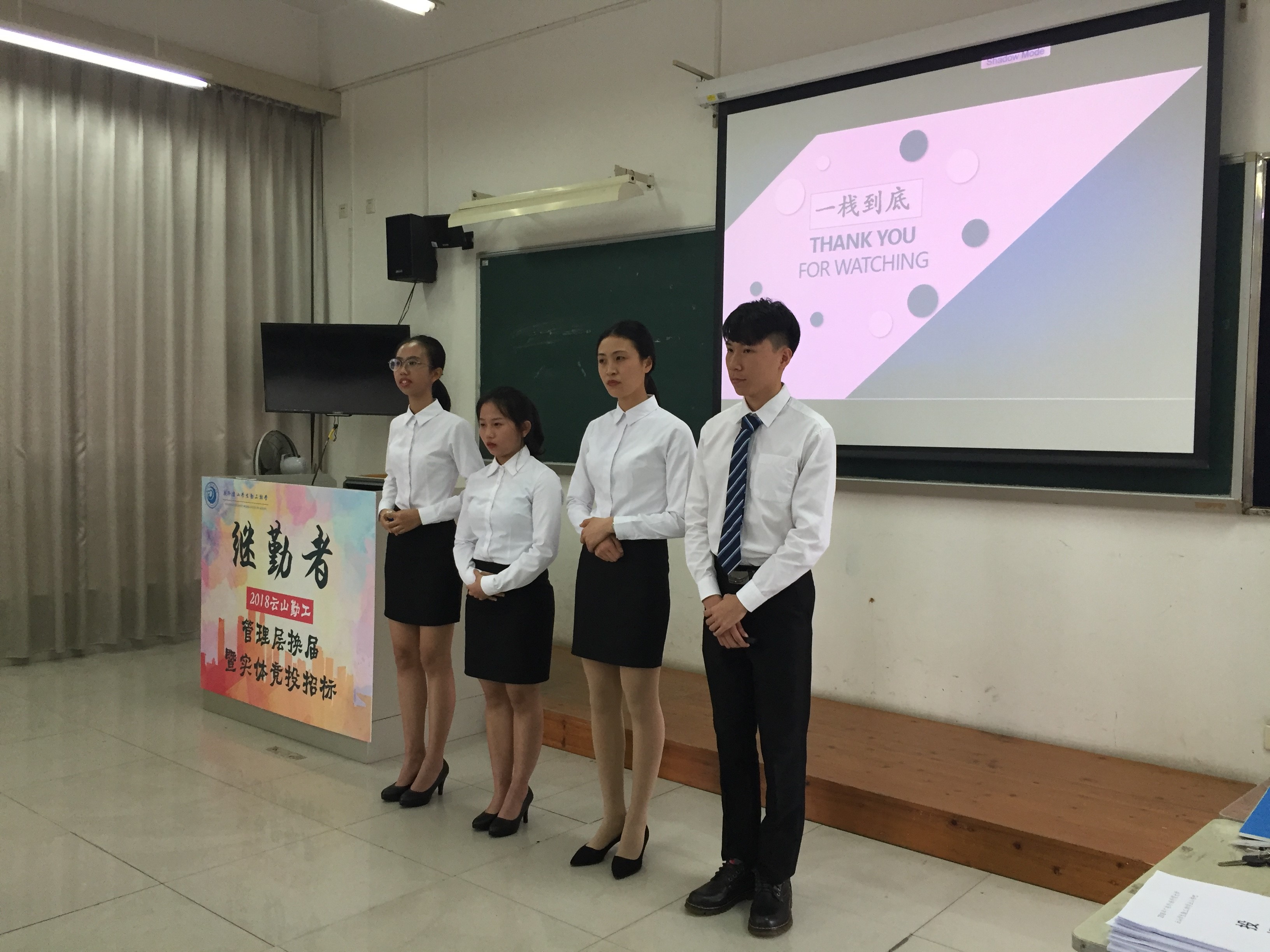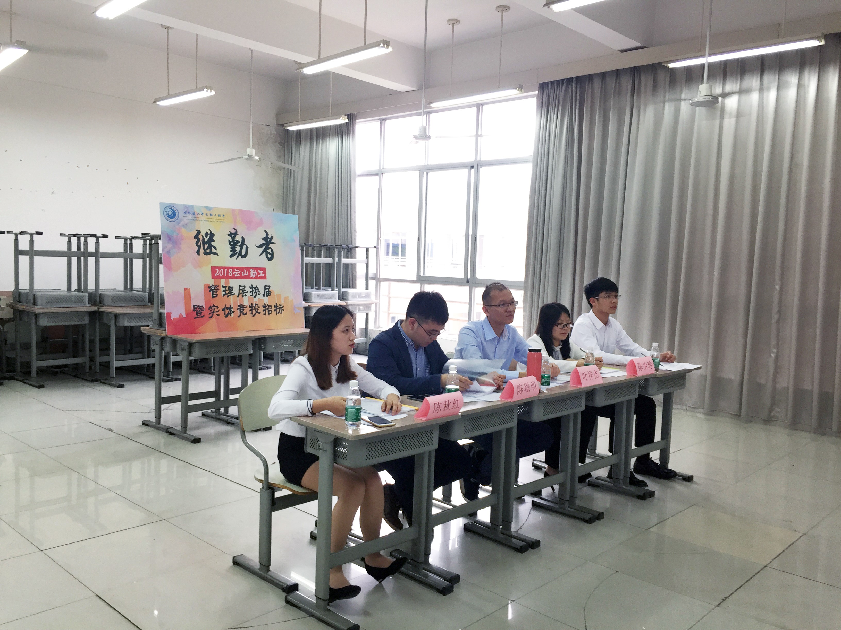 本网讯 3月29日下午,广外云山学生勤工助学(南,以下简称“云山勤工”)2018年实体竞投招标复审在F510和F511顺利举行。本次复赛分两个环节:8分钟竞投书展示和评委提问;目的是对竞投团队进行进一步的实力综合测评。担任本次复赛评委的有:勤工助学科科长叶祥杰、云山勤工指导老师黄星、金融学院团委书记陈璟明、商学院创新创业课讲师殷毅山、现任云山勤工党支部书记陈秋红、常务副董贾化颖、李定欣以及财务部经理陈少玲。