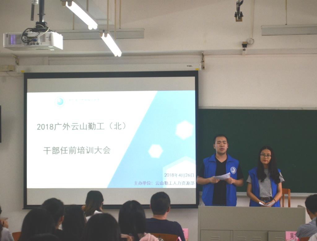 本网讯 4月26日下午两点,2018广外云山学生勤工助学(北,以下简称“云山勤工”)干部任前培训会在六教B402举行,云山勤工指导老师颜求实老师、常务副董事吴灿婷出席了本次会议,此外,会议还邀请到人力资源部经理陈思婷、云山咖啡屋经理吴文辉以及语培经理李科毅。