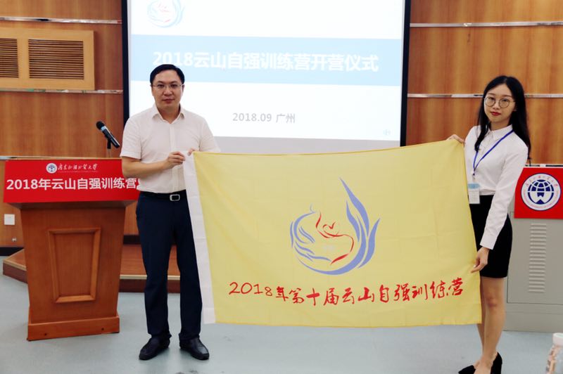 本网讯 9月2日,第十届云山自强训练营开营仪式在北校区云山丝纺讲堂顺利举行。我校副校长刘海春授训练营旗并做题为“广外‘勤工自强人’的DNA——I am WIST”的主题讲座,学生处处长谢应东、副处长刘军、云山勤工和自强社全体指导老师及学生干部出席了本次仪式。