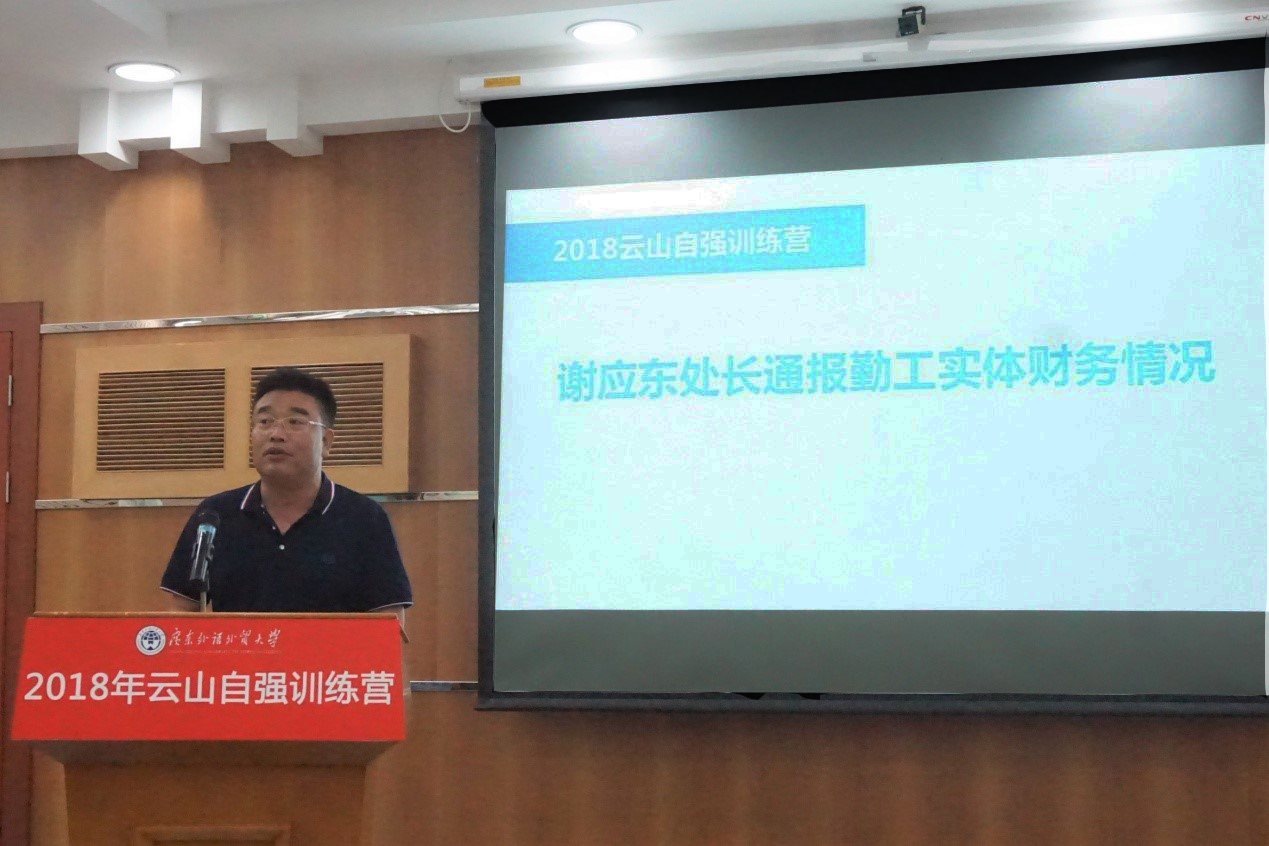 谢应东通报并详细分析了上一年的勤工实体财务情况。谢应东从总收入、成本费用、可支配盈余额等方面通报了总体情况并分析部分勤工实体仍需改进等问题,并且表示学生干部要重视市场调研,树立成本、创新和自立自强的意识以及加强多方面立体宣传,将“云山勤工”的名片擦得更亮。