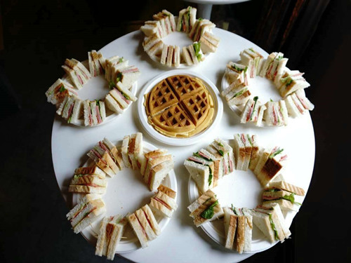 当天下午两点,优座员工开始为接待做准备。工作人员为客人准备了醇香咖啡,香气腾腾的华夫饼和三文治,还有各色茶水。随后,大家将所有制作完成的食物、咖啡和茶水有序摆放在长桌上。