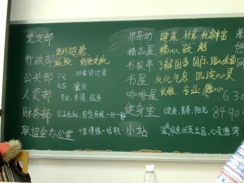 在第一个项目中,参训者被要求按部门组队,通过内部讨论出二到三个词语描述本部门特色。参训者们经过激烈的讨论,将各自定义的部门特色展示出来。书报亭的“精心、精致”,公关部的“WS、RP”,中心联谊会的“千里情缘一线连”等。这个项目主要在于确定参训者对本部门的了解,并为其他参训者提供了解中心内部各部门的机会。