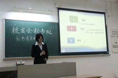 培训伊始,秘书处信息编辑部员工江潞作为当晚主持人向其他部门员工介绍了秘书处的各个事项。而在周泽鸿的发言中,他希望各单位能重视秘书处的工作。另外,他还介绍了校友回校进行分享会的事宜,其中包括预约流程,时间等,他还说明校友会秘书处会协助各部门的校友分享会。最后,他向在场的秘书专员介绍了最近秘书处正在策划筹备的“微爱发声”微公益策划大赛的大体内容,并希望各单位全力支持。