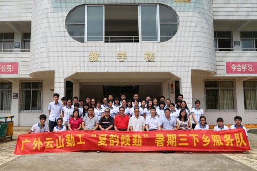 本网讯 7月21日,广东外语外贸大学(以下简称“广外”)学生处处长植秀聪,团委副书记刘勇,清远阳山县扶贫办副主任邹定君,广外阳山县驻村干部毕建永、郑安振等一行来到广东省清远市阳山县岭背中学,在岭背中学副校长陈金生,老师邓家强的陪同下,对在此开展暑期社会实践活动的云山勤工“夏韵倾勤”服务队进行慰问。