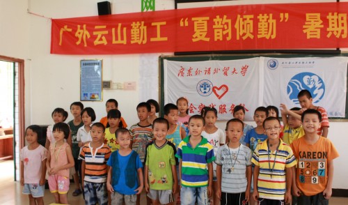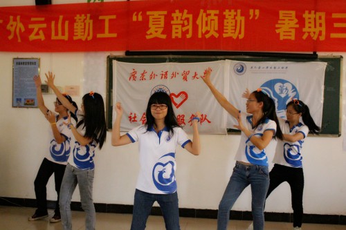 本网讯7月25日上午,广外云山学生勤工助学(以下简称“云山勤工”)”夏韵倾勤”服务队于岭背中学阶梯教室举行了主题为“歌舞青春”的文艺汇演,岭背中学副校长陈金生,云山勤工指导老师黄星出席了本次汇演。