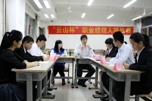 本网讯 3月28日晚,由广外云山学生勤工助学(南,下简称“云山勤工”)主办,广东省职业经理人协会协办的第四届“云山杯”职业经理人挑战赛复赛考评会(下简称“复赛考评会”)在教学楼D栋进行。来自经理人协会的嘉宾郑永康、刘国强、李雪江和张志毅,不仅为本次复赛考评会担任导师,更在“模拟会议”环节中担任各个小组总经理一职,带领选手对其作品进行讨论和开会。