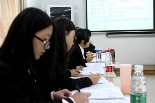 比赛现场气氛严肃认真,面试者们端坐在面试官前面,进行简短的自我介绍和审题后,就要接受面试官们的提问。面对面试官的步步紧逼,有些面试者自信满满,对答如流;有些则微微颤抖,神色紧张。职能部门的面试现场有十二位面试官对着四位面试者,严肃的气场顿时让刚进场的选手倒吸一口气。
