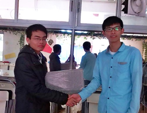 温俊杰(右)代表南校行政部赠送礼物给北校行政部