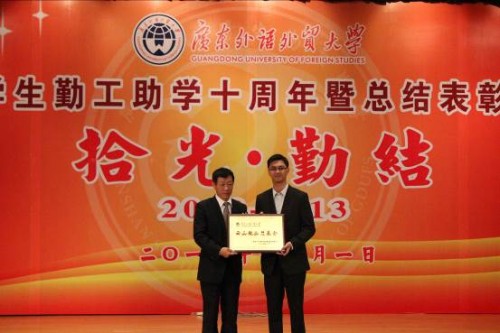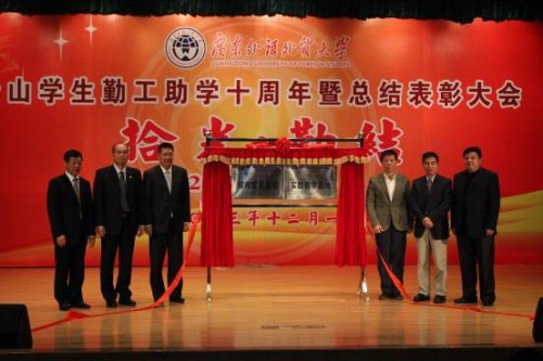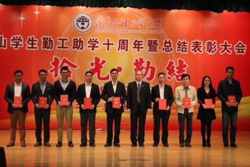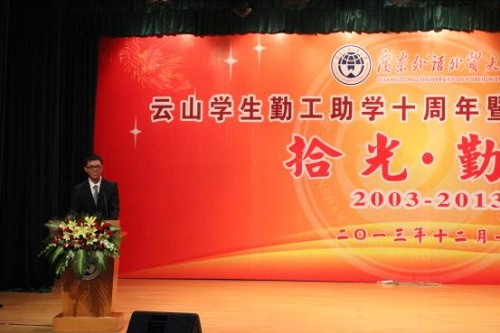 本网讯 今年是云山勤工走过的第十个年头.12月1日下午,广外云山学生勤工助学(下简称”云山勤工”)十周年暨总结表彰大会在广外北校区六教报告厅隆重举行。校长仲伟合、党委副书记卢景辉、副校长许国彬、特邀嘉宾教育厅助学管理中心副主任卓越、广东省青少年发展基金会理事长林乔林以及兄弟高校嘉宾、有关部门负责人、历届学生处老师、云山勤工校友、兄弟高校学生代表学生代表、校内学生代表、云山勤工在校同学共庆十周年盛典。大会由我校学生处处长植秀聪主持。