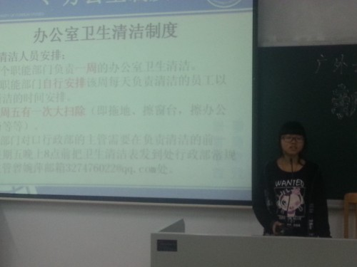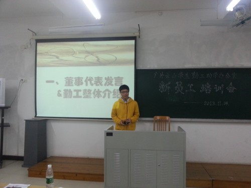 本网讯2013年11月24日晚,广外云山学生勤工助学(以下简称“云山勤工”)在六教B201开展云山勤工办公室新员工培训会(北)。云山勤工董事、各单位经理以及各部门员工均出席了本次会议。