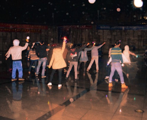 当天傍晚,夜幕早已降临,天公并不作美,还下起了湿冷的小雨。但随着劲爆的音乐声响起,匆匆赶去上课的同学们被头戴灯饰、手戴戒指灯饰的舞会成员欢快的舞步吸引了。周末舞会的成员们随着音乐跳跃着自编的舞步,连跳三曲,其中有新编Disco,也有super hero。在夜幕下观看,和着细雨,另有一番意境。舞曲末尾,舞会成员则高喊“云山周末舞会大型灯光舞会,约定你!”以此谢幕。