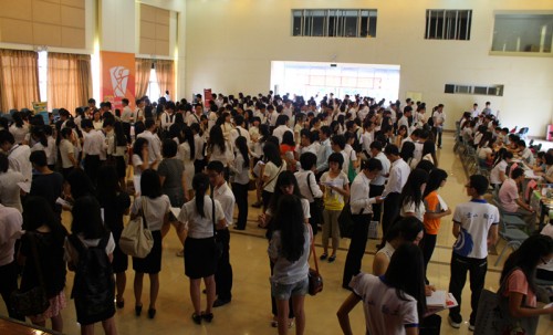 天色已经暗沉,天空中也下起了零星小雨,但却不足以浇盖住现场紧张而富有热情的气氛。招聘会开始不久,在座的应聘者陆陆续续地进场“应战”,偌大的学活会场顿时熙熙攘攘,人声鼎沸,其中有好几家备受“追捧”的进驻商家的面试席前一下子就排起了长龙,场面好不壮观!