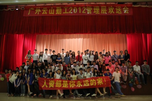 本网讯 4月24日晚,由广外云山学生勤工助学(南,下简称“云山勤工”)董事会主办的云山勤工2012届管理层欢送会在学生活动中心二楼多功能厅顺利举行。虽说是送别晚会,但整个晚会过程却洋溢着欢声笑语和甜甜的幸福。