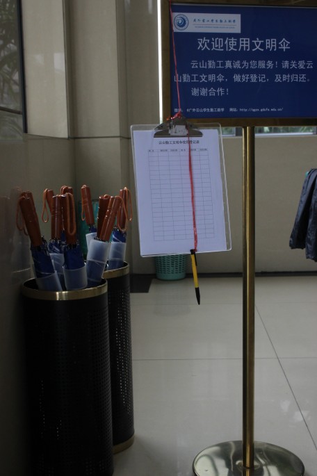 据悉,2013年,云山勤工提供的文明伞不仅数目增多,质量提高,也增多了供应地点。如今,在师生进出频繁的校办公楼也能见到文明伞的影子。阴雨连绵的日子,老师与同学们只需简单的登记就能借到一把充满云山勤工关怀的雨伞。记者在采访中了解到,大部分师生都对云山勤工这一善举表示高度的认可。“有了文明伞,遇上雨天就不用再担心了,云山勤工真的很为我们着想”,新闻学院的李同学在接受采访时说。可见,云山勤工的文明伞不仅方便了学校师生,更让师生们感受到了云山勤工的关怀,使云山勤工真正做到了服务学校,服务师生。