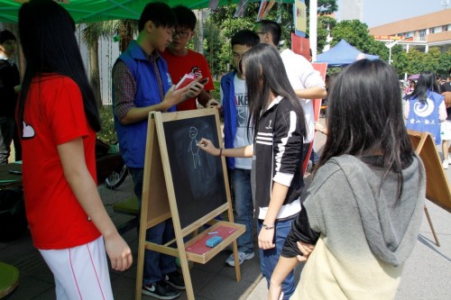为了吸引更多的同学来参观校道展览,主办方还在游戏区设置了“你画我猜”的游戏环节。通过画画猜词的游戏,设置奖项供同学们娱乐。现场一声高过一声的欢呼声,可以看出同学们乐在其中。游戏奖品为富有云山书吧特色的精美明信片、钱包照等。