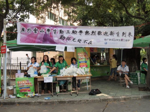 本网讯 9月9日,2012级新生报到的日子。广外云山学生勤工助学(北,下简称“云山勤工”)携手邓老凉茶,在第六教学楼旁的云山凉茶坊及云山书报亭前摆摊设点,一起为新生提供最贴心的服务。