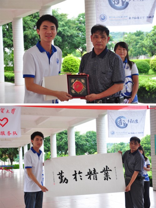 下午2点半,连滩中学还笼罩在一片迷蒙细雨中,但雨水浇不灭大家的热情。三下乡的队员方立波和刘清任本次汇演的主持人。练中强首先代表连滩中学致辞,他感谢“郁乡勤缘”服务队来到连滩中学,给同学们带来了知识,肯定了三下乡的成果,寄语所有队员和同学在今后更加努力学习,并预祝此次文艺汇演完满成功。黄星发表了讲话,他首先对多日来支持三下乡活动的连滩中学表达了感谢。在肯定参加三下乡活动重要性的同时,希望连滩中学的同学们珍惜每次参加夏令营的机会,并欢迎他们报考广外。随后,黄星代表我校云山勤工向连滩中学赠送了纪念品,连滩中学亦回赠一幅书法“业精于勤”,表示了对方对本次实践活动的认可和感谢。随后是义教组的颁奖环节,分别颁发了“优秀班主任”,“优秀教员奖”及“优秀学生奖”。