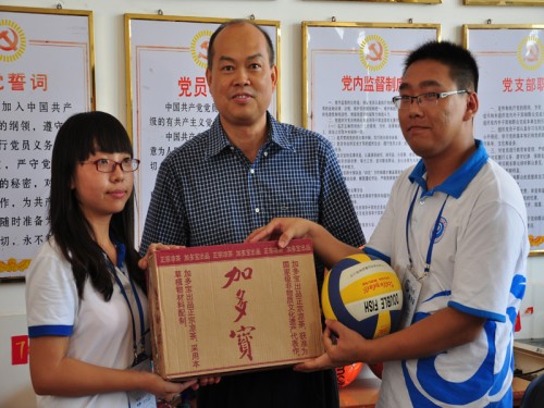卢景辉代表广东外语外贸大学,向“郁乡勤缘”服务队赠送一批药品及夏日消暑饮品。同时学生处向连滩中学捐赠了一批体育用品,包括篮球、排球、足球、毽子等,进一步完善了连滩中学的体育设备。此举将极大丰富学生们的课余活动,促进学生身心更加健康地发展。为表感谢,连滩中学回赠卢景辉一幅毛笔字“厚德载物”。