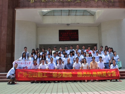 最后,卢景辉发表讲话。他表达了三个“感动”,其一,对服务队牺牲假期休息时间,志愿来到较艰苦地区支持教育、了解社会的服务精神的感动;其二,对郁南县政府部门大力支持大学生暑期三下乡社会实践活动的感动;其三,对服务队细致周全地做准备,开展一系列有益于郁南的义教、调研、宣传活动的感动。他特别指出,服务队关于国家助学贷款政策的宣传活动意义非凡。他表示,就算学生家庭经济有困难,难以负担上大学的各项支出,也可以通过助学贷款,一圆大学梦。而致力于让学生“学习无忧、生活无虑、思想无惑”的广外更是可以保证这一点。他还提醒队员们在按计划完成工作的同时,要注意安全,注意防暑,“高高兴兴出来,平平安安回去,一个都不能少”。最后,他寄语“心手相连,情系连滩,支教乐教,教人求真”,希望“郁乡勤缘”服务队以此自勉。