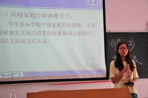 此次宣讲会由文宣组组长易佩红担任主讲人。考虑到多数家长听不懂普通话,易佩红特意用粤语进行讲解。她从高校家庭经济困难学生资助政策、国家助学贷款政策、其他高等学校学生资助政策三方面入手,用浅显易懂、生动形象的语言进行了详细的介绍。