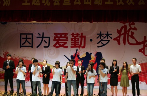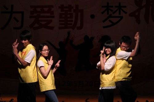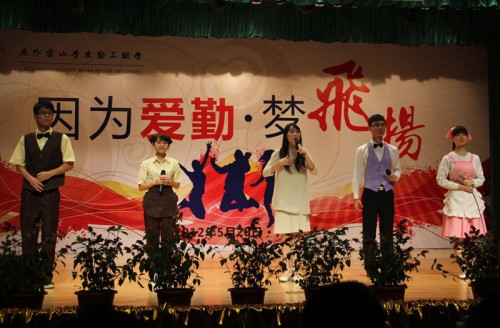 编者按 2012年5月20日晚,广东外语外贸大学第二届云山学生勤工助学(下简称勤工)主题晚会“因为爱勤,梦飞扬”在六教报告厅隆重举行。南北两个校区的实体结合自己特色,为晚会展现了一场场精彩表演。现场座无虚席,气氛热烈,历届勤工人共同享受了一场盛宴。下面让我们跟随图片,回忆一个个精彩瞬间。