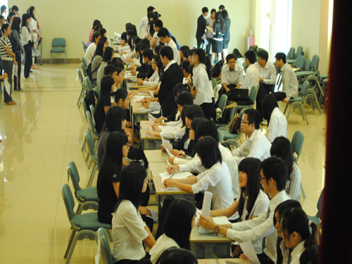 参加此次招聘的大多数为大一学生,此外也有不少大二学生。大学生活缤纷多彩,接触形式各异的社团活动后更是期盼能在大学生涯中走上一段勤工助学的道路。应聘者中很多都是自信满满、谈笑自若,当然也有因紧张而表述混乱,甚至前言不搭后语。招聘会现场出现了小高潮,中心公共关系部和云山凉茶坊出现了两队“长龙”,场面的火爆可见一斑。在谈及个人优势时,大一应聘者普遍以上一学期在学校其他社团的工作经验为例,大二应聘者底气十足,列出了不少获奖项目证明自身的工作经验。