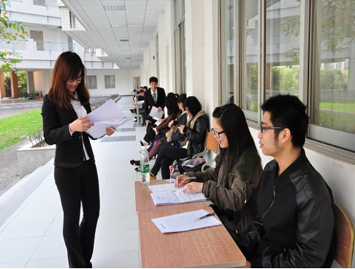 记者来到面试地点时,面试正有条不紊地进行着。课室外,工作人员正认真地进行着面试者的签到登记以及简历的收集。等候区,面试者们安静地整理心情、准备上场。