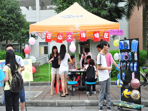 记者来到校道,单单各摊位色彩缤纷的装饰已经让人眼花缭乱,更别提云山跳蚤市场制作的风车立宣品、云山文体特区摆出的丰富文体用品、云山周末舞会摆出的身着舞衣的人体模特了。云山水榭咖啡屋更是搬出了水榭特色——古风韵水车来吸引路人的眼球。各单位为了宣传新员工招聘可谓是使尽了全身解数。