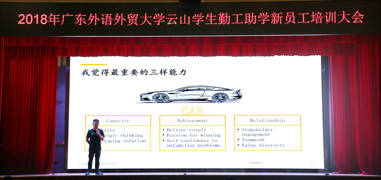 本网讯 2018年11月3日,广外云山学生勤工助学(南,以下简称“云山勤工”)新员工培训大会在学生活动中心多功能厅举行。勤工助学科科长叶祥杰、指导老师黄星、党支部、董事会、各单位管理层出席本次培训会。