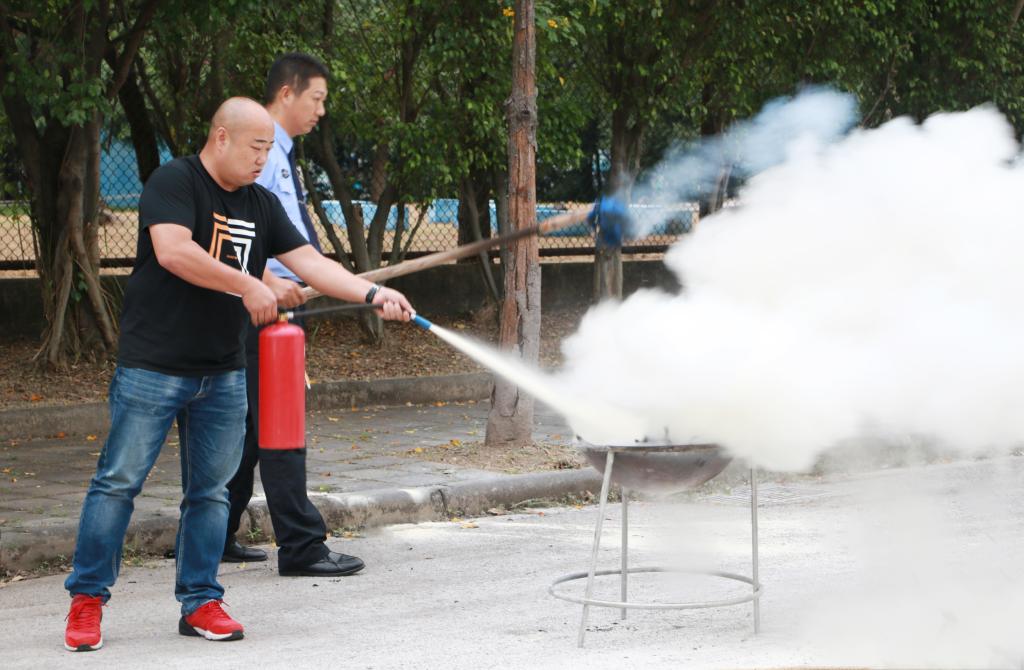 徐铭带领员工们来到室外进行灭火演练。他提醒员工们需要做好平时的消防安全工作,遇到火情时要沉着冷静,尽量减少人员财产的损失。他还讲解了灭火器的具体使用方法并进行正确示范,员工们在他的指导下逐一体验,将理论转化为实践。