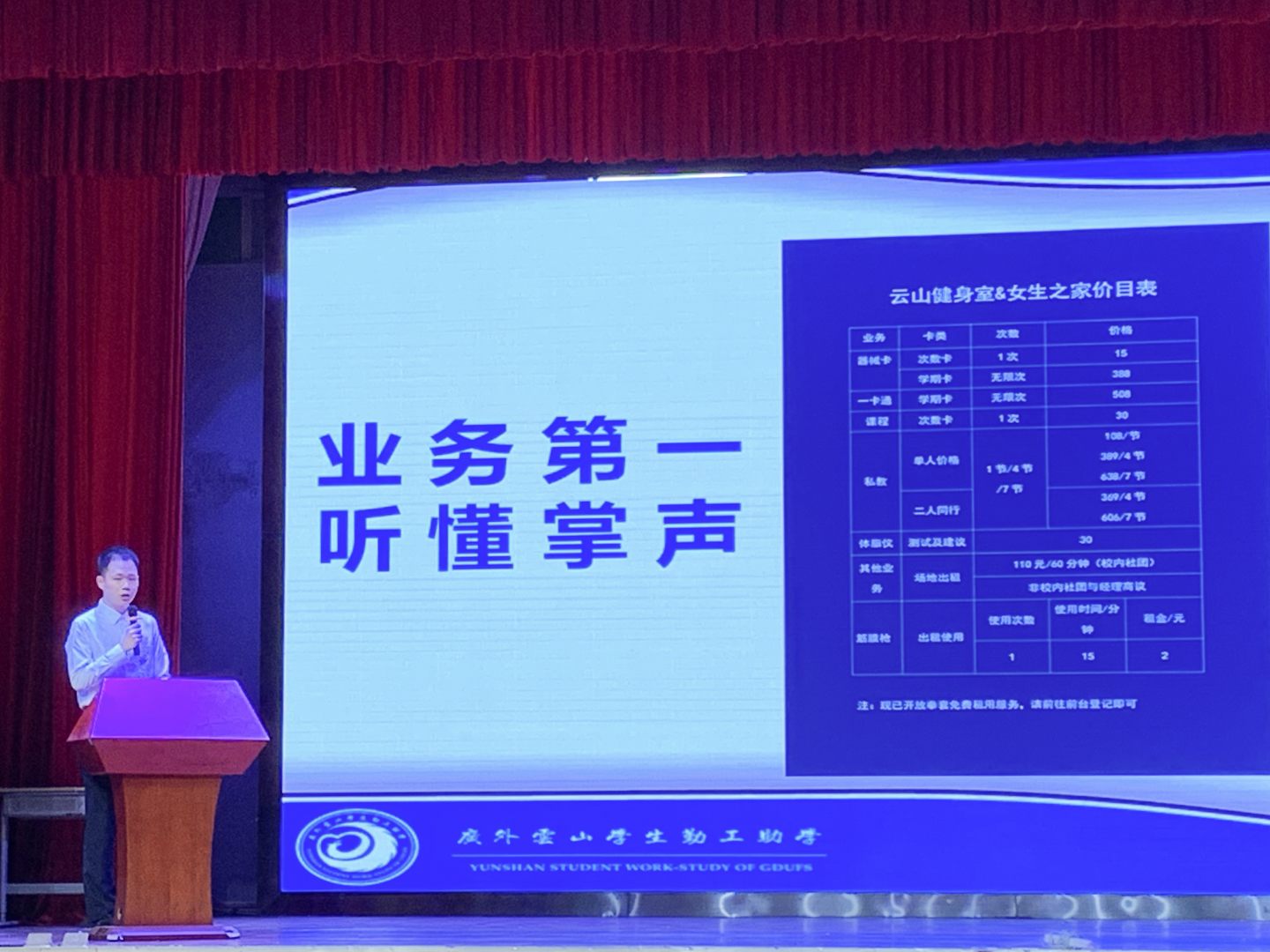 前财务部经理郑舒展简单介绍了财务部的日常工作,并以例会和团建内容为例作部门建设经验分享。前云山健身室&女生之家经理林仕杰以近三年云健办卡业务的改革为例介绍了实体的销售经验。云山忆站新任经理莫凯淳分享了在新任工作中的体验到的酸甜苦辣,以及在交接过程中收获的自我提升以及勤工情谊。