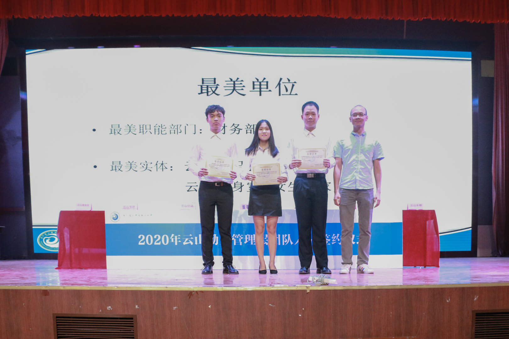 会上,人资部经理公布了2019-2020表彰颁奖的评选结果。最美单位有财务部、云山兼职服务办办公室和云山健身室&女生之家;优秀干部有王锐、郑舒展、陈莹、郑少丽和张宇等;优秀员工有罗善茵、叶晓彤、陈墨轩和陈文凤等。叶祥杰科长为他们颁发了荣誉证书。