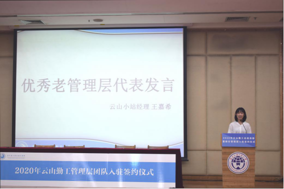 会中勤工的新老管理层代表依次上台进行了分享。第一位是上一届校友会联络部经理李栩宜同学,她以自己在工作中积累的丰富经验向我们提出了三个关键词——“危机意识”、“责任感”与“校友”。第二位是上一届云山小站经理王嘉希同学,一方面她谈到自己在勤工的工作中收获颇丰;另一方面她还给新一届管理层提出“不要惧怕改变,不要惧怕吃苦”。第三位是新任云山健身室经理叶穗沂同学,她用一个词“成长”概括了自己在勤工的所得所感。