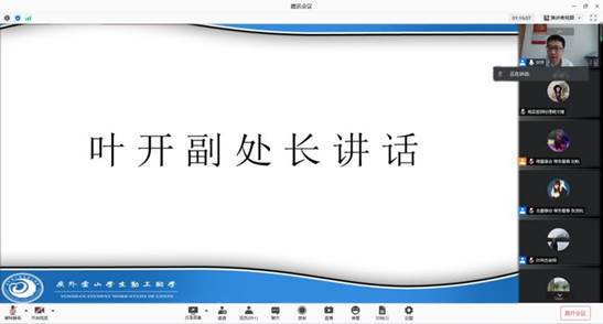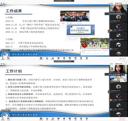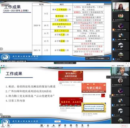 本网讯 2021年7月8日,广东外语外贸大学云山学生勤工助学(下简称“云山勤工”)在线上开展了2020-2021学年第二学期勤工工作总结会,由各部门和实体对第二学期工作进行汇报总结。与会人员包括学生处副处长叶开、学生资助管理中心科长叶祥杰、云山勤工指导老师及南北校勤工常务董事、管培生、经理和主管。