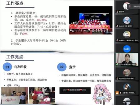 云山兼职服务办公室(南)经理李肇敏在汇报工作亮点时提到,本学期成功开办了暑期实习招聘会,参会企业对兼职办良好的服务态度与招聘会现场的精心布置给予高度的评价,并表示愿意在未来继续与广外兼职办合作。此外,兼职办微信公众号关注人数持续增长,影响力不断扩大,成为广外同学获取兼职信息的重要渠道。