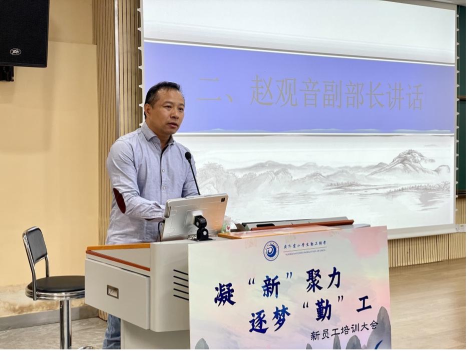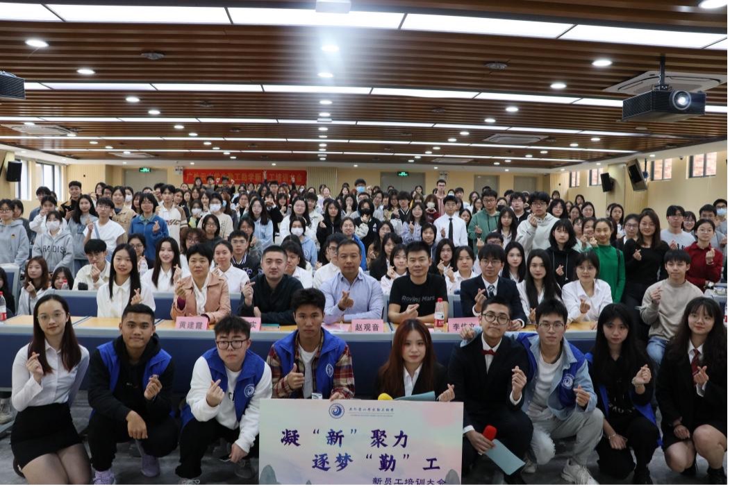 本网讯 2023年3月4日上午,广外云山学生勤工助学(北)新员工培训大会于北校区一教南楼109隆重举行。出席本次会议的有学生工作部副部长赵观音,勤工指导老师颜求实、李伟文、黄建霞;董事会成员、各单位经理层及全体新员工参加本次新员工培训大会。本次大会的主题是凝心聚力,逐梦勤工。