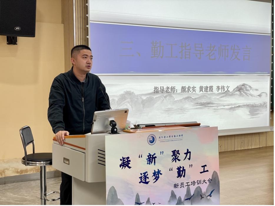 随后颜求实老师上台发言,他首先对新加入的“勤工人”表示祝贺,又引导大家从自身出发,思考勤工对自身的意义所在。颜求实老师指出,在勤工,大家能够在日常生活中收获真挚的友谊、在所在岗位中收获专业技能、得到收入、减轻家庭负担、提升自身沟通及协调能力,也能够获得参与管理培训课程的机会,提升自身能力。工作之余,“勤工人”可以参加创业比赛,他鼓励新员工报名组建勤工创业团队,把握机会,同时,他鼓励大家向党组织靠拢,积极参与党组织活动。最后,他希望大家脚踏实地,行能致远。