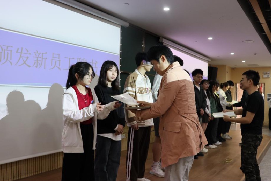 在万众期待的聘书颁发环节,赵观音副部长和勤工指导老师颜求实,李伟文,黄建霞为新员工颁发聘书。当各单位新员工代表将聘书接过的那一刻,属于新一代“勤工人”的新篇章也随之开启。