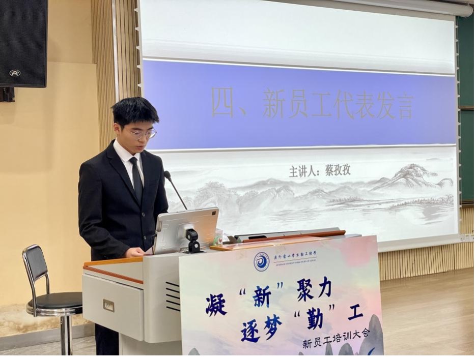 新员工发言代表蔡孜孜同学表示,他十分感谢前辈们的指引帮助、伙伴的鼓励。同时,他认为,作为董事会管培生,在各单位轮岗实习的经历可以使其更好更快地了解与融入勤工整体,并使管培生成为单位员工与董事会间的反馈渠道。在一次次历练中,他学会了勇敢面对问题,解决问题。他鼓励大家主动出击,临危不惧,敢于突破艰难险阻。他相信,新一代勤工人能紧握照亮未来的火炬,永秉青云志,砥砺复前行,也祝愿大家秉持初心,笃行不怠,携手共建云山勤工的新辉煌。