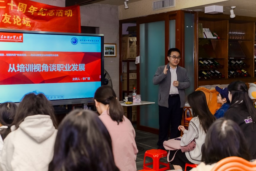 留达出国创始人兼CEO、广外云山勤工校友理事会副会长黄崇本校友则先是真切表示广外标准化培养人才模式以及在云山勤工的经历深深影响着他,云山勤工教会了他:读书的时候也可以赚钱。再通过历史上被铭记的留学生来讲解留学行业的兴起,并且通过介绍留学和考研的标准,启发同学们:英语跟专业素养非常重要以及要找好自己的方向。随后他分享了自己的职业发展路径,进一步为同学们提供经验和参考。黄崇本校友还表示,大学不仅仅有成绩,大学生活也是丰富多彩的,殷切地祝福同学们创造属于自己的未来。