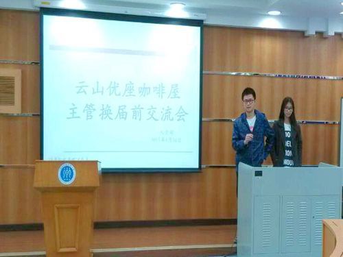 本网讯 2015年4月10日晚上8点,广外云山优座咖啡屋(北,下简称“优座”)在九教103教室举行了主管层换届前交流会。本次交流会旨在鼓励优座员工积极参与本学期优座管理层的竞选,用自己的力量为优座担起一份责任,并努力超越自我,磨练自我,做更优秀的自己。
