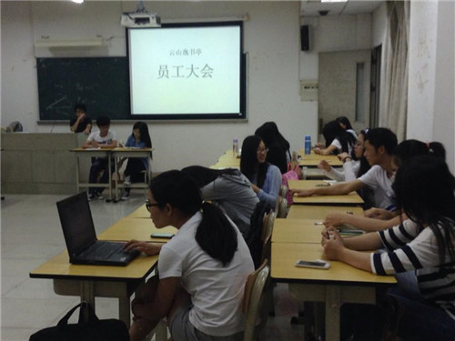 本网讯 2015年4月17日晚,云山逸书亭(南,下简称“逸书亭”)召开了四月份员工大会,会议流程有部门工作汇报、招新活动、勤人节活动总结、大事项汇报以及经理寄语。
